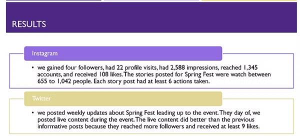 The campaign culminated in the planning and execution of our annual Spring Fest event. Spring Fest served as the capstone deliverable, showcasing all of the rec center's offerings, including available classes, locations, and events, to the entire student body.